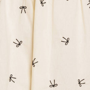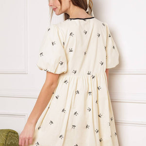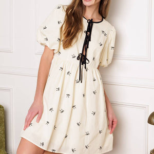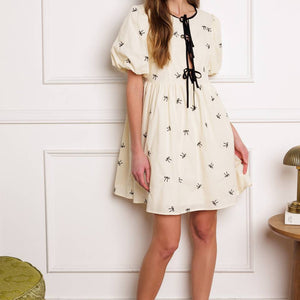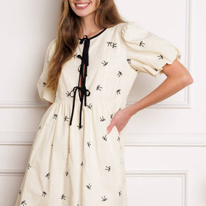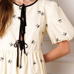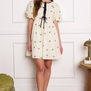 A perfect addition to your wardrobe, this solid embroidered mini dress is designed with a round neckline and adorable front bow ties, accompanied by short puff sleeves.