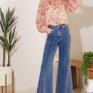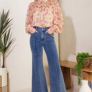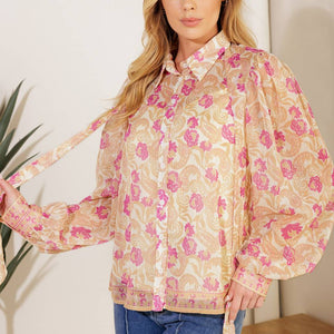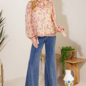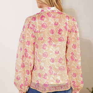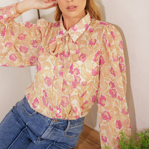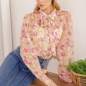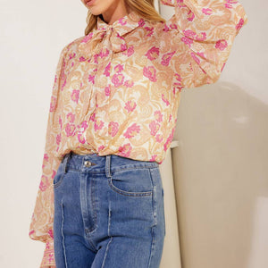 A printed woven top featuring front button down, bow tie, long sleeve and cami