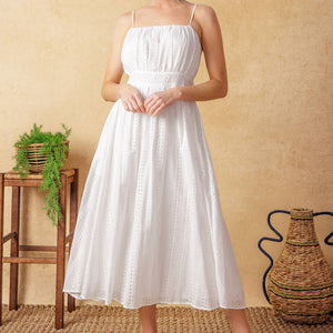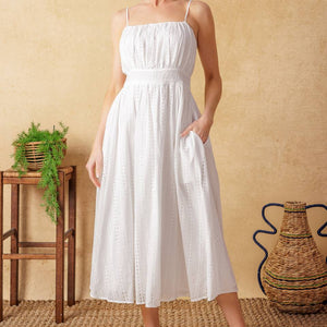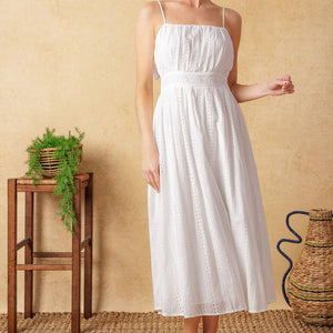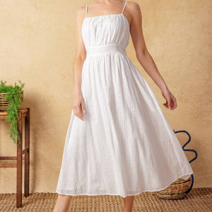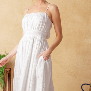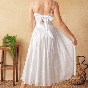 A solid eyelet midi dress featuring straight neckline, straps, full skirt and back tie