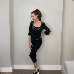 The Vivienne Vintage Top is a perfect blend of classic charm and modern glam. Featuring a flattering sweetheart neckline with a gathered bust, this top enhances your silhouette effortlessly. The long cuffed sleeves add a touch of sophistication, while the comfortable pull-on design ensures easy, all-day wear. Crafted in a stunning black fabric with a subtle sparkle, this beauty pairs perfectly with skirts or trousers for a chic, vintage-inspired look.